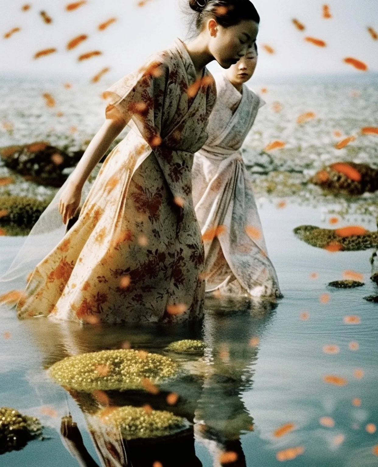 Her portrayals of women—figures from all walks of life—are both diverse and unified, often seamlessly blending into the landscapes they inhabit. Presented alone, in pairs, or in harmonious groups, these characters exude calm and neutrality, providing a serene pause in a world of tumultuous emotions. Dancing on the intersections of fashion, nature, sci-fi, and portraiture, Bonnie's work invites viewers into a dreamscape where reality and fantasy intertwine.