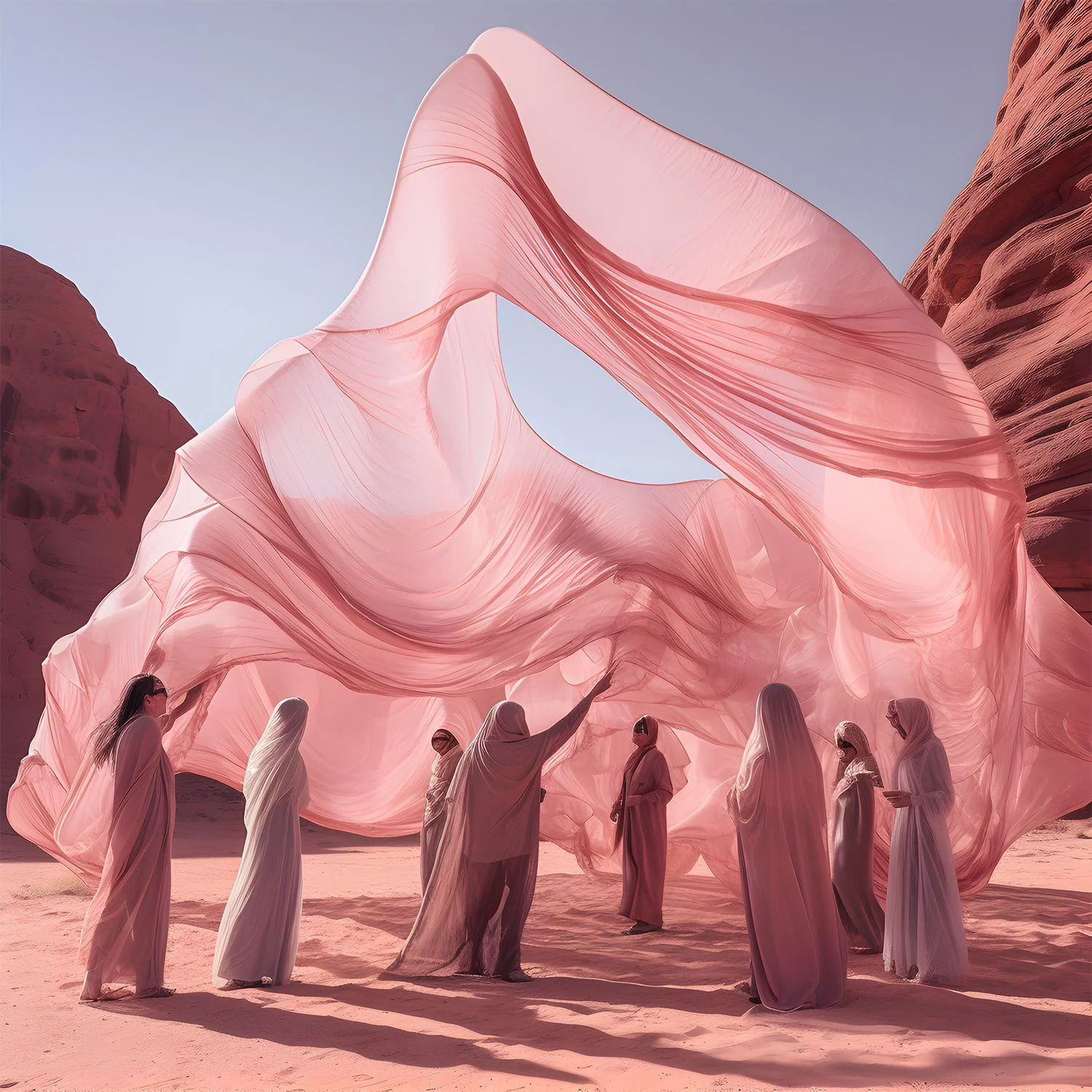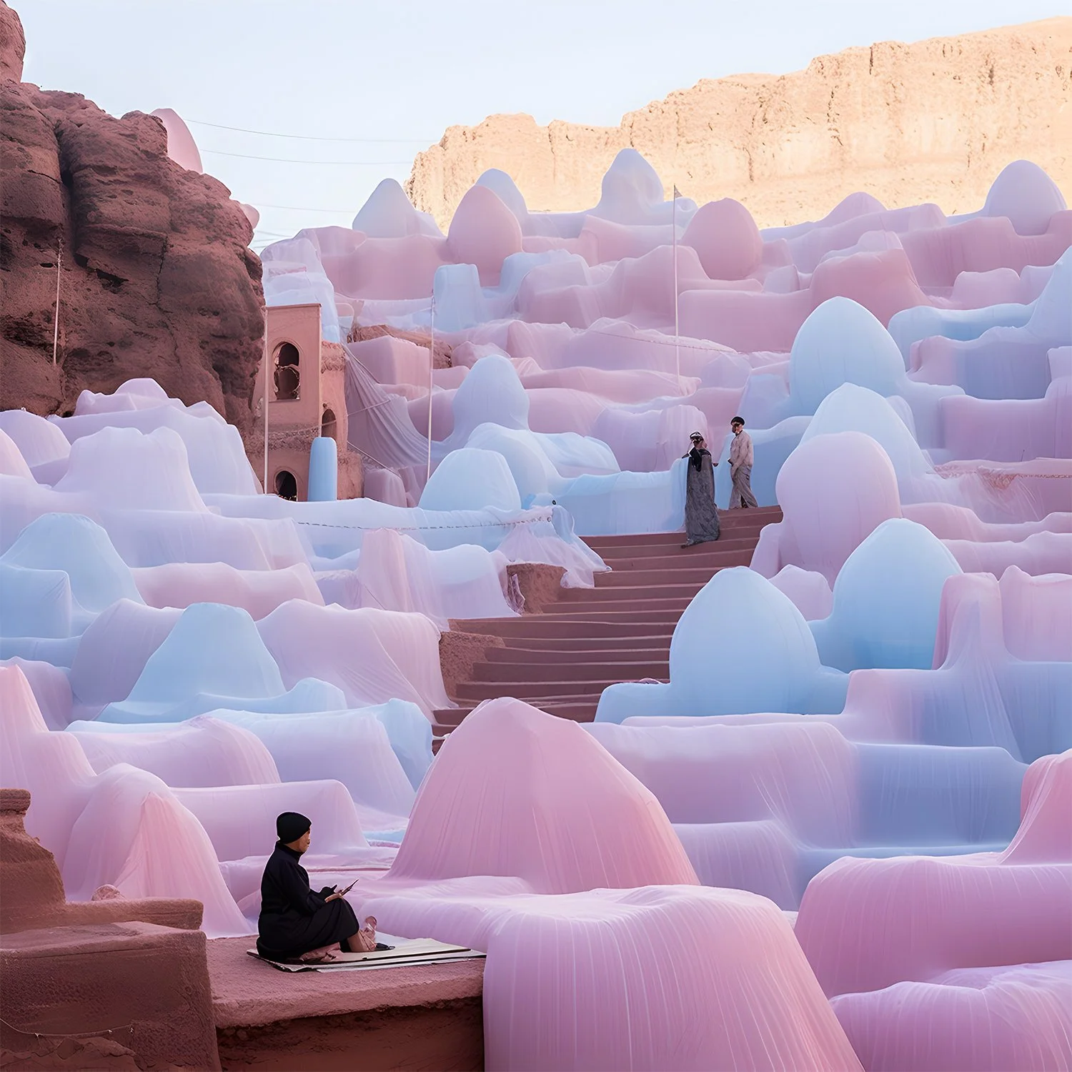 Dubai-based artist, @futurebedouin crafts a mesmerizing dance between the past and the future. Drawing deeply from the well of Arabic culture and heritage, she weaves intricate narratives inspired by real locations within the Arabian peninsula and the rich tapestry of Arab stories. With a masterful play on colors, scale, and textures, her art beckons viewers into ethereal landscapes where one can almost feel the silkiness of surfaces and the gentle pop of bubbles. Her blend of desert vistas with its inhabitants, juxtaposed against avant-garde architecture and fashion, creates a duality in her pieces. Sometimes they merge seamlessly with their surroundings, while at other times, they contrast strikingly with vibrant hues. As an AI artist, her innovative approach has not only garnered acclaim but also led to collaborations with a diverse range of brands.