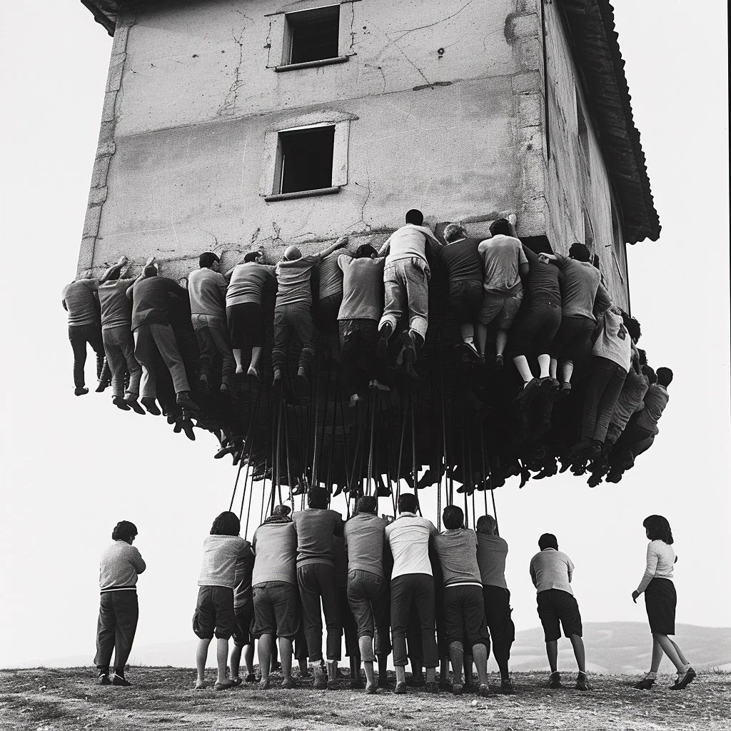 An image I feel proud to have made depicts a group of tenants struggling to keep a house from floating away. I generated this image in response to the housing crisis that my city is experiencing. It captures the sense of hopelessness that many renters feel, that struggle as they might secure housing gets further out of reach. I find that the images I'm most proud of are the ones with themes I feel the strongest about.